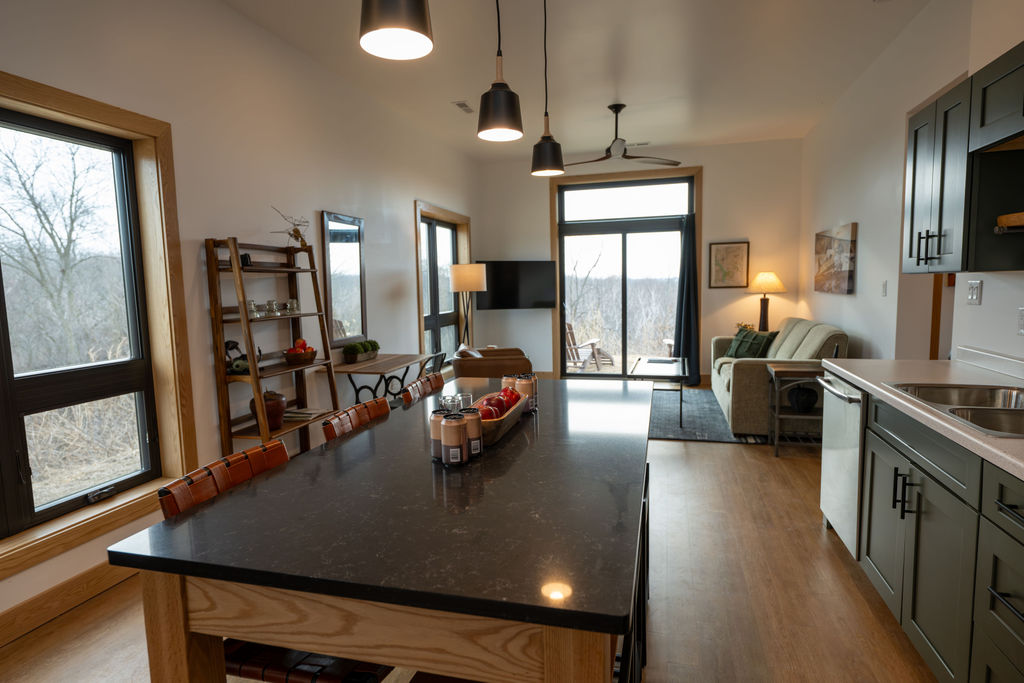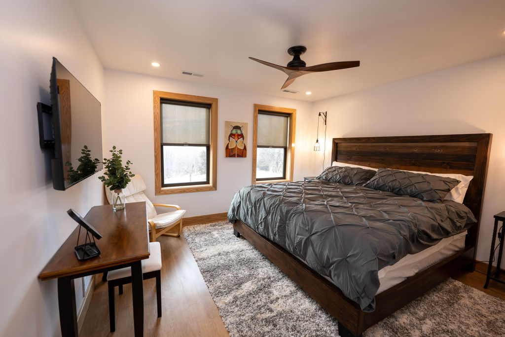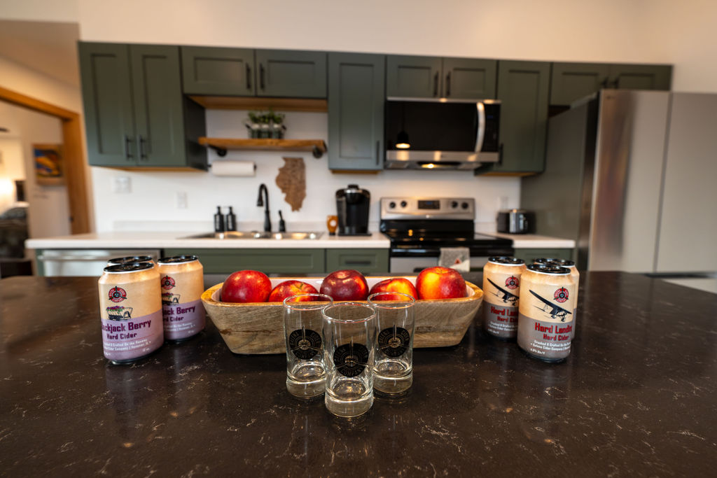 Relax in the modern comfort of a cozy well-appointed guest suite surrounded by wooded views. This aviation-inspired space is perfect for nature lovers, pilots, and snow skiers in the winter. Experience beautiful sunsets to the west and amazing sunrises along the runway at this one-of-a-kind retreat. On fall weekends, enjoy apple season with fresh picked apples, apple cider donuts, and hard cider in our tasting room. Walk the property’s 2000 tree Apple Orchard or hike the 10 miles of trails at the adjacent 1,000 acre Witkowsky State Wildlife Area.